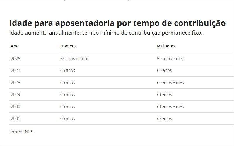 - O tempo mínimo de contribuição é de 30 anos para as mulheres e de 35 para os homens.