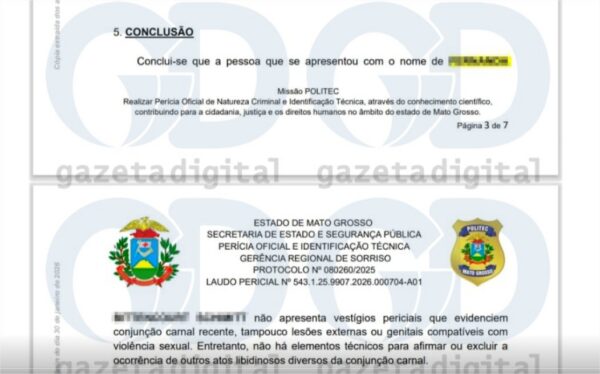 “Não apresenta vestígios periciais que evidenciem conjunção carnal recente, tampouco lesões externas ou genitais compatíveis com qualquer tipo de violência sexual”, traz trecho revelador da perícia da Politec (Perícia Oficial e Identificação Técnica do Estado de Mato Grosso) que o Gazeta Digital teve acesso.