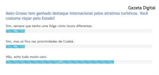 Entre os que afirmaram viajar, 13% disseram que costumam permanecer apenas nas proximidades de Cuiabá, enquanto outros 13% relataram que aproveitam folgas para conhecer diferentes regiões do Estado.