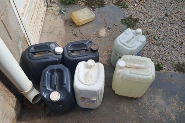 Em uma residência, foram encontrados recipientes contendo substâncias compatíveis com combustíveis.
